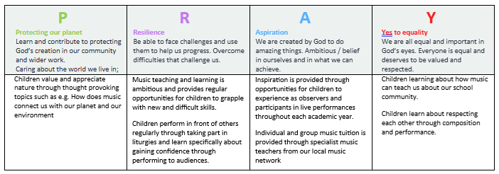 The universal language of Music embodies and gives expression to one of the highest forms of creativity and communication. The transformational power of music offers all learners a channel to discover their God-given talents. Music endeavours to enable pupils to give expression to the heights and the depths of their emotions, hopes and longings and may transcend the limitations found in other forms of communication.